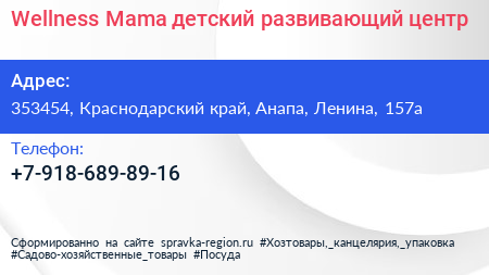 Wellness Mama, детский развивающий центр по адресу 353454, Краснодарский край, Анапа, Ленина, 157а в дальнейшем Организация, размещена в следующих категориях: