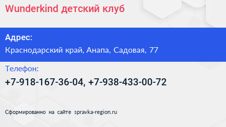 Wunderkind, детский клуб по адресу Краснодарский край, Анапа, Садовая, 77 в дальнейшем Организация, размещена в следующих категориях: