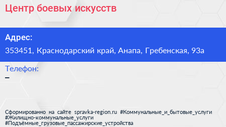 Центр боевых искусств по адресу 353451, Краснодарский край, Анапа, Гребенская, 93а в дальнейшем Организация, размещена в следующих категориях: