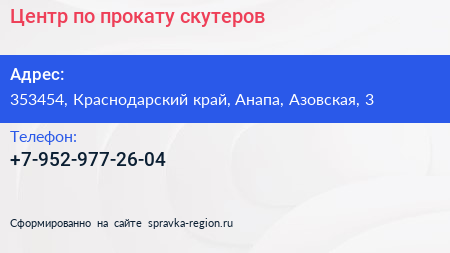 Центр по прокату скутеров по адресу 353454, Краснодарский край, Анапа, Азовская, 3 в дальнейшем Организация, размещена в следующих категориях: