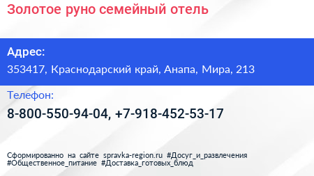 Золотое руно, семейный отель по адресу 353417, Краснодарский край, Анапа, Мира, 213 в дальнейшем Организация, размещена в следующих категориях: