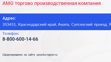 AMG, торгово-производственная компания по адресу 353451, Краснодарский край, Анапа, Супсехский проезд, 9 в дальнейшем Организация, размещена в следующих категориях: