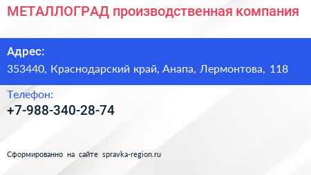 МЕТАЛЛОГРАД, производственная компания по адресу 353440, Краснодарский край, Анапа, Лермонтова, 118 в дальнейшем Организация, размещена в следующих категориях: