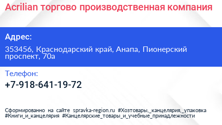 Acrilian, торгово-производственная компания по адресу 353456, Краснодарский край, Анапа, Пионерский проспект, 70а в дальнейшем Организация, размещена в следующих категориях: