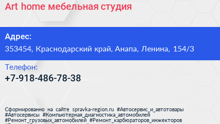 Art & home, мебельная студия по адресу 353454, Краснодарский край, Анапа, Ленина, 154/3 в дальнейшем Организация, размещена в следующих категориях: