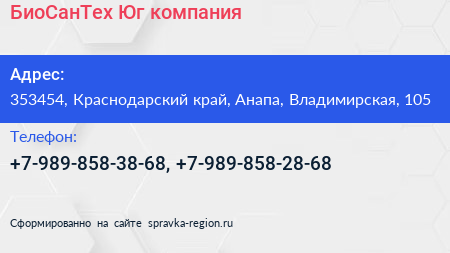 БиоСанТех-Юг, компания по адресу 353454, Краснодарский край, Анапа, Владимирская, 105 в дальнейшем Организация, размещена в следующих категориях: