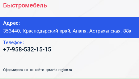 Быстромебель по адресу 353440, Краснодарский край, Анапа, Астраханская, 88а в дальнейшем Организация, размещена в следующих категориях: