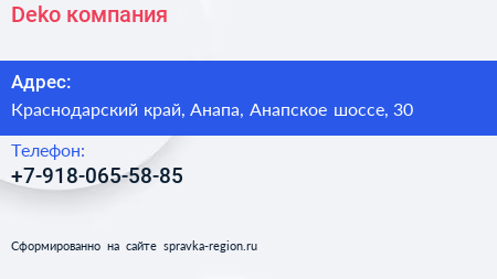 Deko, компания по адресу Краснодарский край, Анапа, Анапское шоссе, 30 в дальнейшем Организация, размещена в следующих категориях: