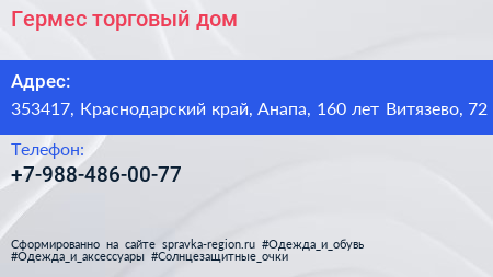 Гермес, торговый дом по адресу 353417, Краснодарский край, Анапа, 160 лет Витязево, 72 в дальнейшем Организация, размещена в следующих категориях: