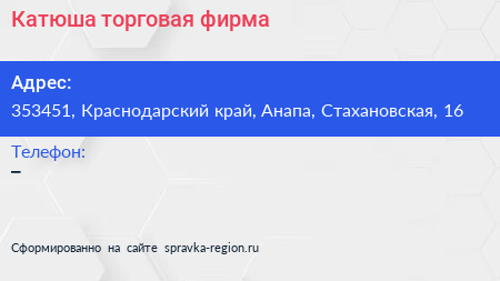 Катюша, торговая фирма по адресу 353451, Краснодарский край, Анапа, Стахановская, 16 в дальнейшем Организация, размещена в следующих категориях:
