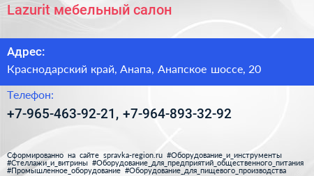 Lazurit, мебельный салон по адресу Краснодарский край, Анапа, Анапское шоссе, 20 в дальнейшем Организация, размещена в следующих категориях:
