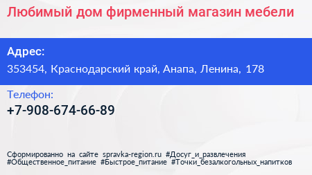 Любимый дом, фирменный магазин мебели по адресу 353454, Краснодарский край, Анапа, Ленина, 178 в дальнейшем Организация, размещена в следующих категориях: