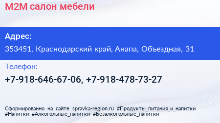 М2М, салон мебели по адресу 353451, Краснодарский край, Анапа, Объездная, 31 в дальнейшем Организация, размещена в следующих категориях:
