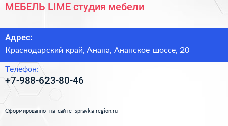 МЕБЕЛЬ LIME, студия мебели по адресу Краснодарский край, Анапа, Анапское шоссе, 20 в дальнейшем Организация, размещена в следующих категориях:
