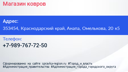 Магазин ковров по адресу 353454, Краснодарский край, Анапа, Омелькова, 20 к5 в дальнейшем Организация, размещена в следующих категориях: