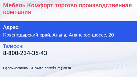 Мебель Комфорт, торгово-производственная компания по адресу Краснодарский край, Анапа, Анапское шоссе, 20 в дальнейшем Организация, размещена в следующих категориях: