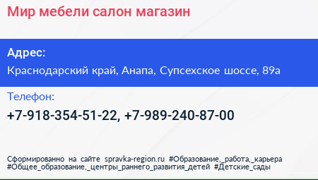 Мир мебели, салон-магазин по адресу Краснодарский край, Анапа, Супсехское шоссе, 89а в дальнейшем Организация, размещена в следующих категориях:
