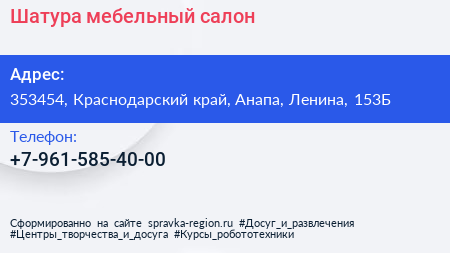 Шатура, мебельный салон по адресу 353454, Краснодарский край, Анапа, Ленина, 153Б в дальнейшем Организация, размещена в следующих категориях: