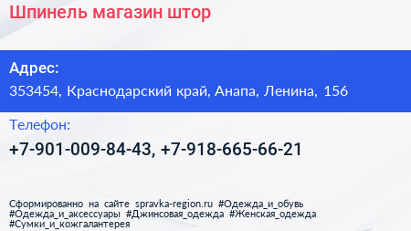 Шпинель, магазин штор по адресу 353454, Краснодарский край, Анапа, Ленина, 156 в дальнейшем Организация, размещена в следующих категориях: