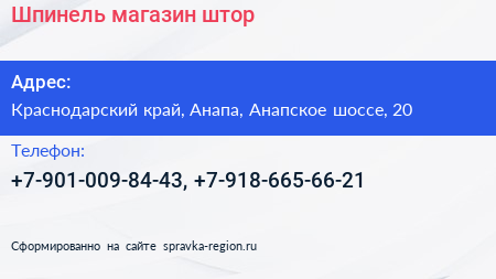 Шпинель, магазин штор по адресу Краснодарский край, Анапа, Анапское шоссе, 20 в дальнейшем Организация, размещена в следующих категориях: