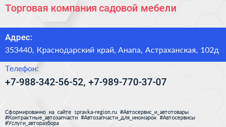Торговая компания садовой мебели по адресу 353440, Краснодарский край, Анапа, Астраханская, 102д в дальнейшем Организация, размещена в следующих категориях: