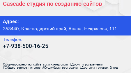 Cascade, студия по созданию сайтов по адресу 353440, Краснодарский край, Анапа, Некрасова, 111 в дальнейшем Организация, размещена в следующих категориях: