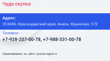 Чудо скупка по адресу 353440, Краснодарский край, Анапа, Крымская, 172 в дальнейшем Организация, размещена в следующих категориях: