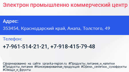 Электрон, промышленно-коммерческий центр по адресу 353454, Краснодарский край, Анапа, Толстого, 49 в дальнейшем Организация, размещена в следующих категориях: