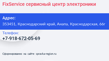 FixService, сервисный центр электроники по адресу 353451, Краснодарский край, Анапа, Краснодарская, 66г в дальнейшем Организация, размещена в следующих категориях: