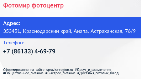 Фотомир, фотоцентр по адресу 353451, Краснодарский край, Анапа, Астраханская, 76/9 в дальнейшем Организация, размещена в следующих категориях: