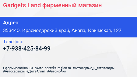 Gadgets Land, фирменный магазин по адресу 353440, Краснодарский край, Анапа, Крымская, 127 в дальнейшем Организация, размещена в следующих категориях: