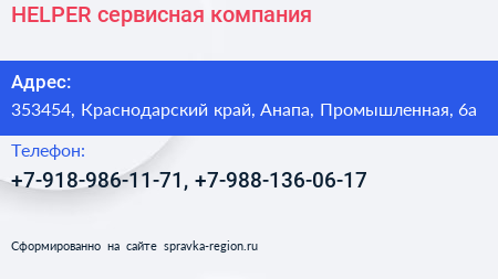 HELPER, сервисная компания по адресу 353454, Краснодарский край, Анапа, Промышленная, 6а в дальнейшем Организация, размещена в следующих категориях: