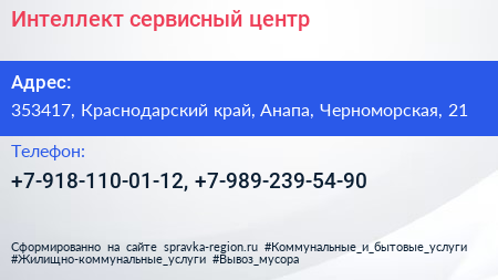 Интеллект, сервисный центр по адресу 353417, Краснодарский край, Анапа, Черноморская, 21 в дальнейшем Организация, размещена в следующих категориях: