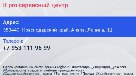 It-pro, сервисный центр по адресу 353440, Краснодарский край, Анапа, Ленина, 11 в дальнейшем Организация, размещена в следующих категориях: