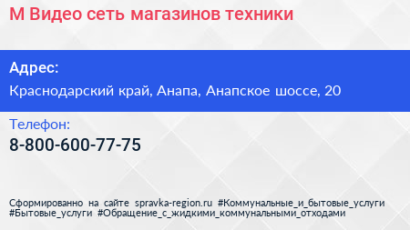 М.Видео, сеть магазинов техники по адресу Краснодарский край, Анапа, Анапское шоссе, 20 в дальнейшем Организация, размещена в следующих категориях:
