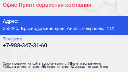 Офис-Принт, сервисная компания по адресу 353440, Краснодарский край, Анапа, Некрасова, 111 в дальнейшем Организация, размещена в следующих категориях: