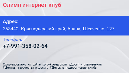 Олимп, интернет-клуб по адресу 353440, Краснодарский край, Анапа, Шевченко, 127 в дальнейшем Организация, размещена в следующих категориях: