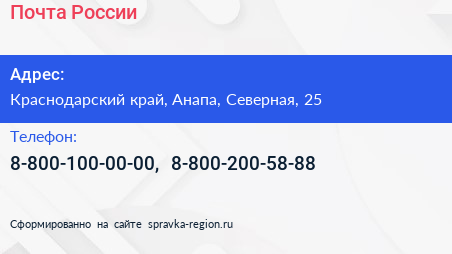 Почта России по адресу Краснодарский край, Анапа, Северная, 25 в дальнейшем Организация, размещена в следующих категориях: