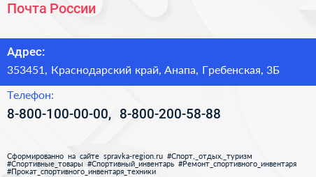 Почта России по адресу 353451, Краснодарский край, Анапа, Гребенская, 3Б в дальнейшем Организация, размещена в следующих категориях: