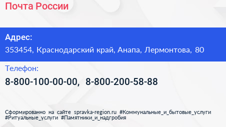 Почта России по адресу 353454, Краснодарский край, Анапа, Лермонтова, 80 в дальнейшем Организация, размещена в следующих категориях: