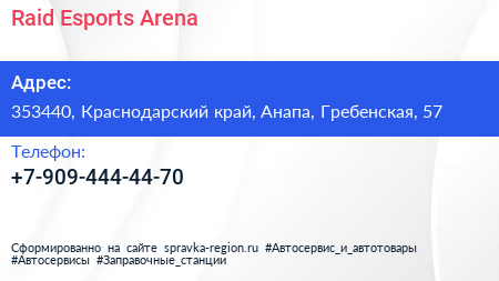 Raid Esports Arena по адресу 353440, Краснодарский край, Анапа, Гребенская, 57 в дальнейшем Организация, размещена в следующих категориях: