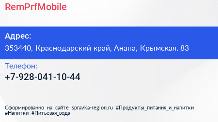 RemPrfMobile по адресу 353440, Краснодарский край, Анапа, Крымская, 83 в дальнейшем Организация, размещена в следующих категориях: