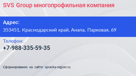 SVS Group, многопрофильная компания по адресу 353451, Краснодарский край, Анапа, Парковая, 69 в дальнейшем Организация, размещена в следующих категориях: