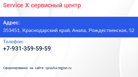 Service X, сервисный центр по адресу 353451, Краснодарский край, Анапа, Рождественская, 52 в дальнейшем Организация, размещена в следующих категориях: