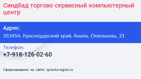Синдбад, торгово-сервисный компьютерный центр по адресу 353454, Краснодарский край, Анапа, Омелькова, 21 в дальнейшем Организация, размещена в следующих категориях: