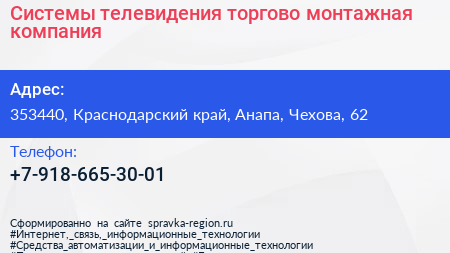 Системы телевидения, торгово-монтажная компания по адресу 353440, Краснодарский край, Анапа, Чехова, 62 в дальнейшем Организация, размещена в следующих категориях: