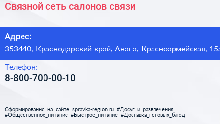 Связной, сеть салонов связи по адресу 353440, Краснодарский край, Анапа, Красноармейская, 15а в дальнейшем Организация, размещена в следующих категориях: