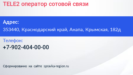TELE2, оператор сотовой связи по адресу 353440, Краснодарский край, Анапа, Крымская, 182д в дальнейшем Организация, размещена в следующих категориях: