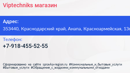 Viptechniks, магазин по адресу 353440, Краснодарский край, Анапа, Красноармейская, 13г в дальнейшем Организация, размещена в следующих категориях:
