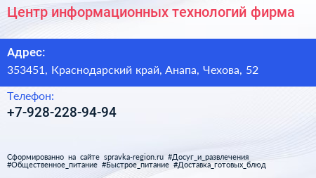 Центр информационных технологий, фирма по адресу 353451, Краснодарский край, Анапа, Чехова, 52 в дальнейшем Организация, размещена в следующих категориях: